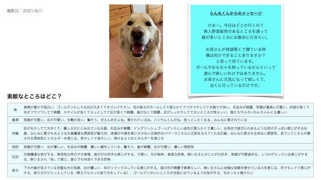今回はお写真でのコミュニケーションで、お写真も1枚だけ。しかもわんちゃんの正面だけで全身が見えないタイプのお写真ということで、褒めるところも限られてしまうパターンなのですが、このパターンのお写真は見えるところ全てに素敵なところを見つけて褒めて行きましょう。